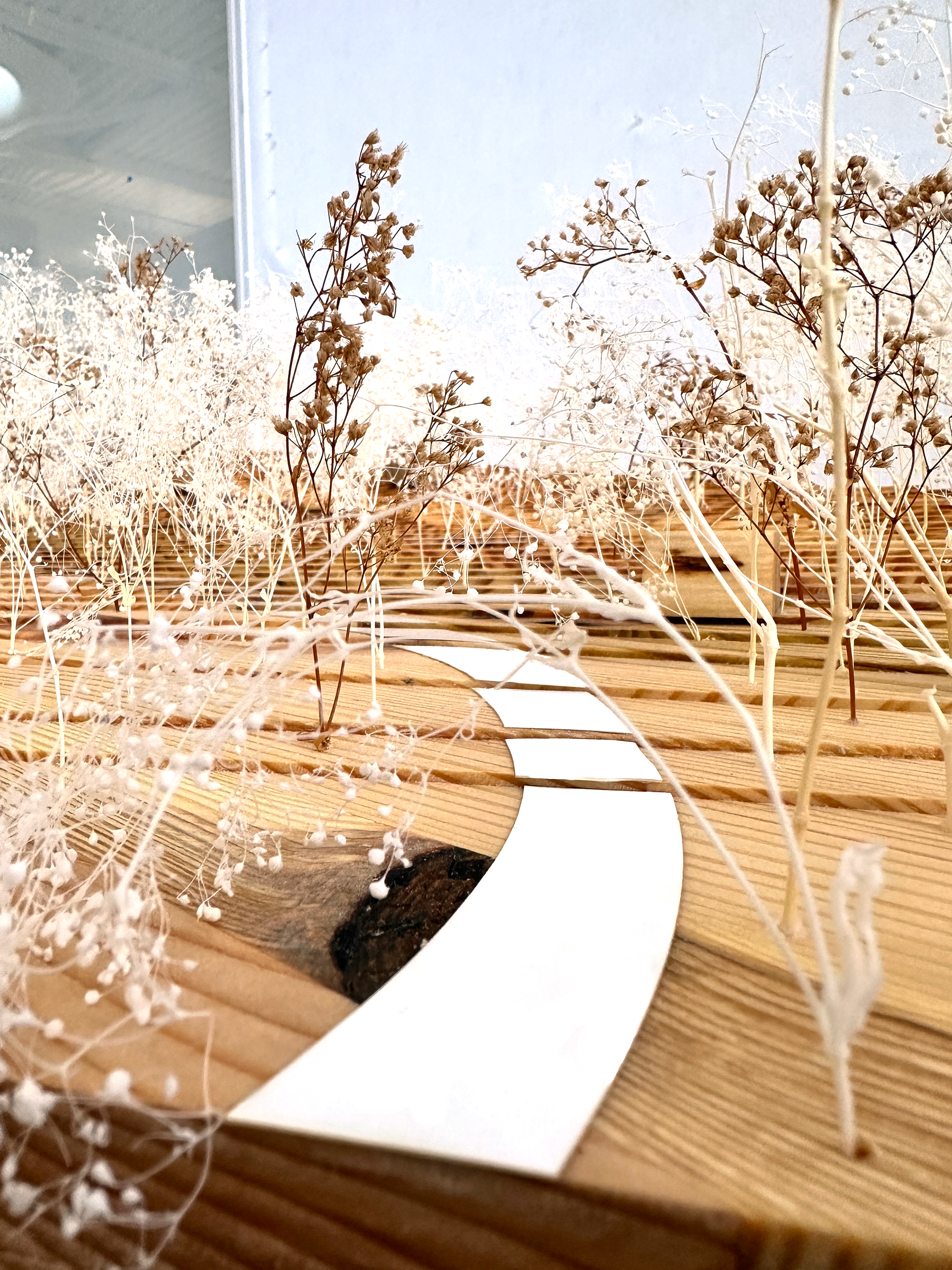 Our design was focused on leaving the field open. We wanted to allow visitors to be able to wonder through the site and celebrate the contrast from the deep forest to the open view sheds that the field supplied. We also used the crest of the site to create a densely connected program that flowed into a more personal experience as you gravitate central